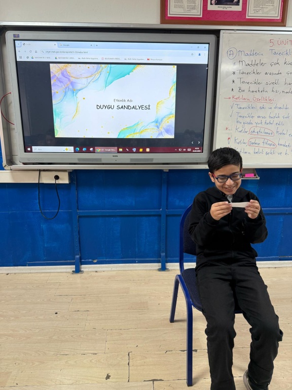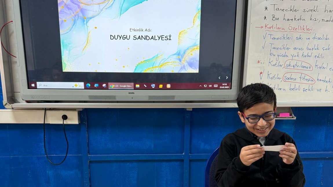 Okulumuzda, 5. Sınıf öğrencilerimize yönelik “ Duygu Sandalyesi” etkinliği düzenlenmiştir. Etkinlikte öğrencilerizin değişen duygu durumlarını fark etmeleri drama çalışmasıyla desteklenmiştir. Bu etkinliği düzenleyen Rehber Öğretmenimiz Tuğba UĞUŞ'a teşekkür ederiz.