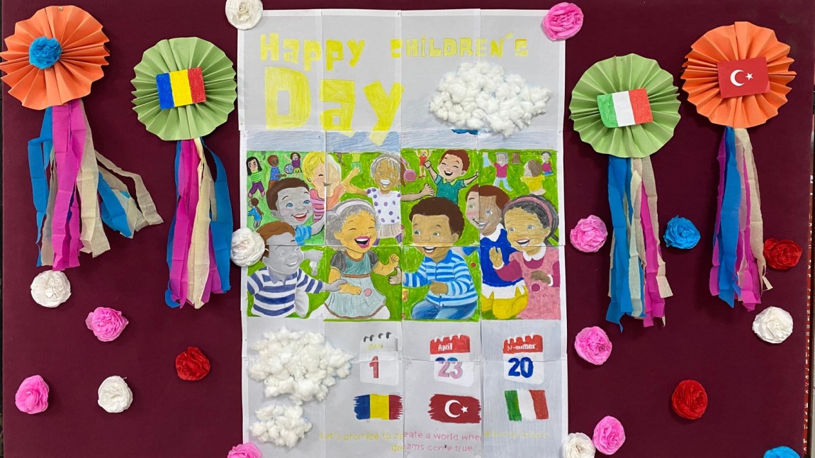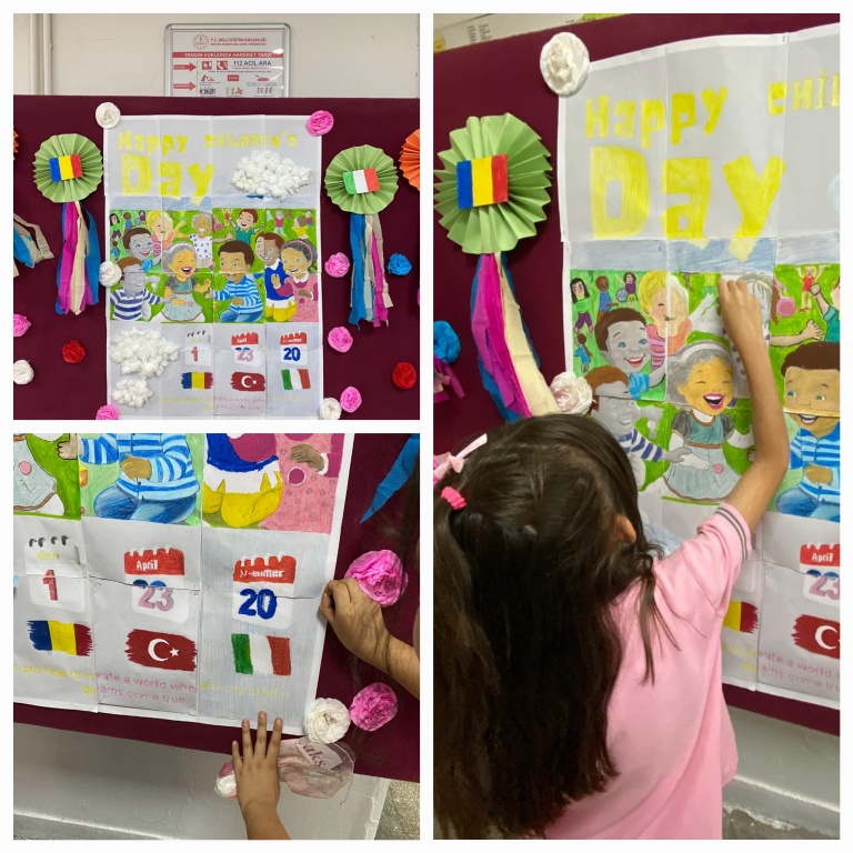 Ortak ürünümüz olan ulusal çocuk bayramı posterimizi birleştirdik ve okul panomuzda sergiledik.